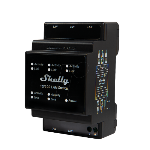 Le Shelly LAN Switch est un switch Ethernet compact à 5 ports RJ45 (10/100 Mbps), conçu pour une installation sur rail DIN et alimenté directement en 110–230 V AC, offrant une connexion réseau stable et fiable à vos équipements domotiques.